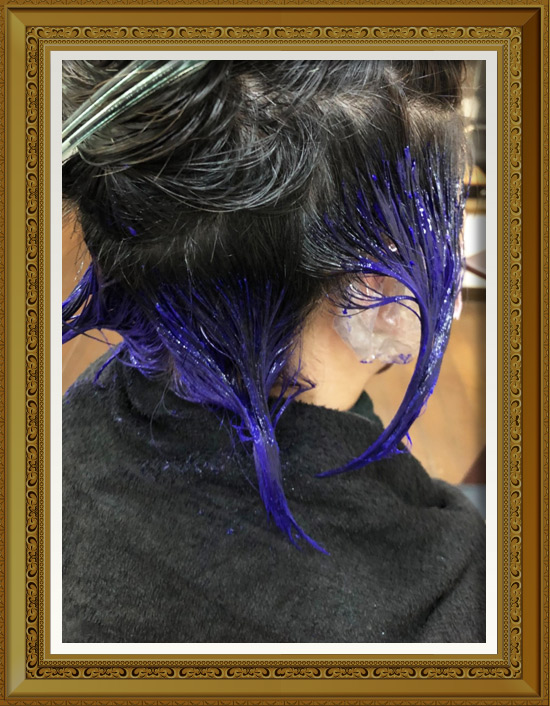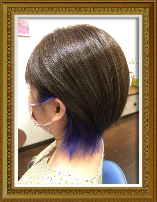 インナーカラーネープラインはブリーチ、インナーカラー以外の部分には8トーンのグレイジュブラウンを塗布。 また、ブリーチをした部分にロカビリーブルーの塩基性カラーを塗布。お客様の望み通りの色が綺麗に入りました。 色落ちを抑えるため、シャンプーはムラサキシャンプーを使用。